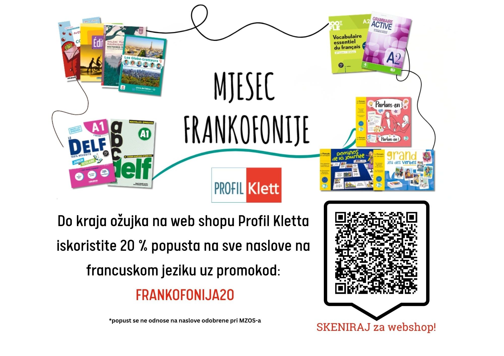 Nastavljamo s obilježavanjem Frankofonije u Osijeku uz poseban popust od -20% na kupnju francuskih naslova kod našeg partnera Profil Klett. Uz kod FRANKOFONIJA20 do kraja mjeseca ostvarite popust na sve naslove na francuskom jeziku*. Akcije se ne odnose na naslove odobrene pri Ministarstvu*